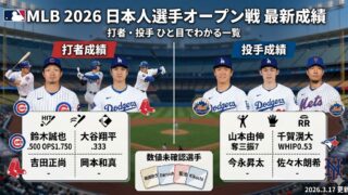 | 15日(水) | MLB ジャッキー・ロビンソン・デー (全30球団が試合) | – | – |