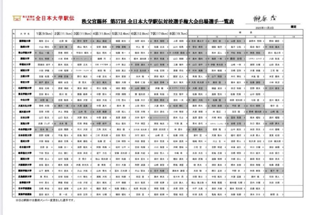・最終メンバーは大会当日朝の変更を反映済みです。公式の区間配置(27チーム一括掲載)はこちら: