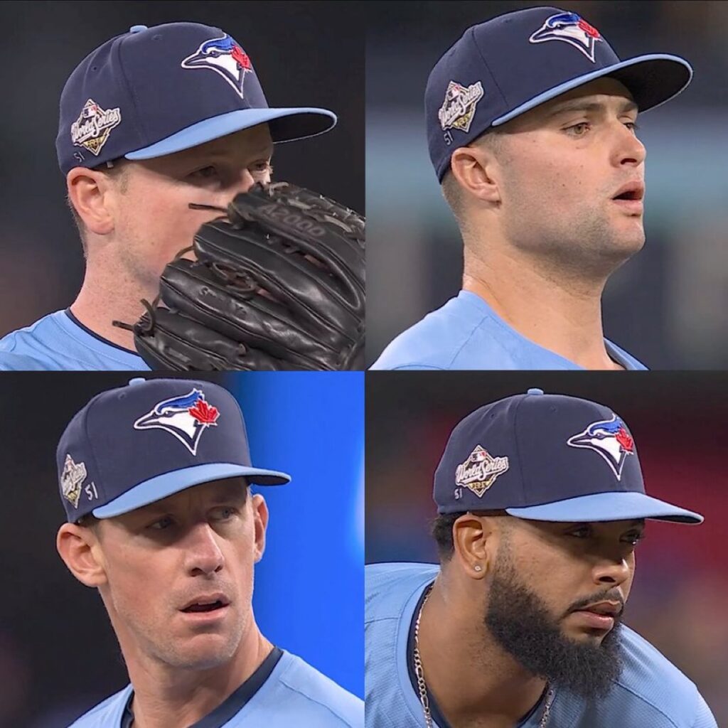 第6戦のブルペンで、ブルージェイズの投手たちも「51」を帽子に記入しました。