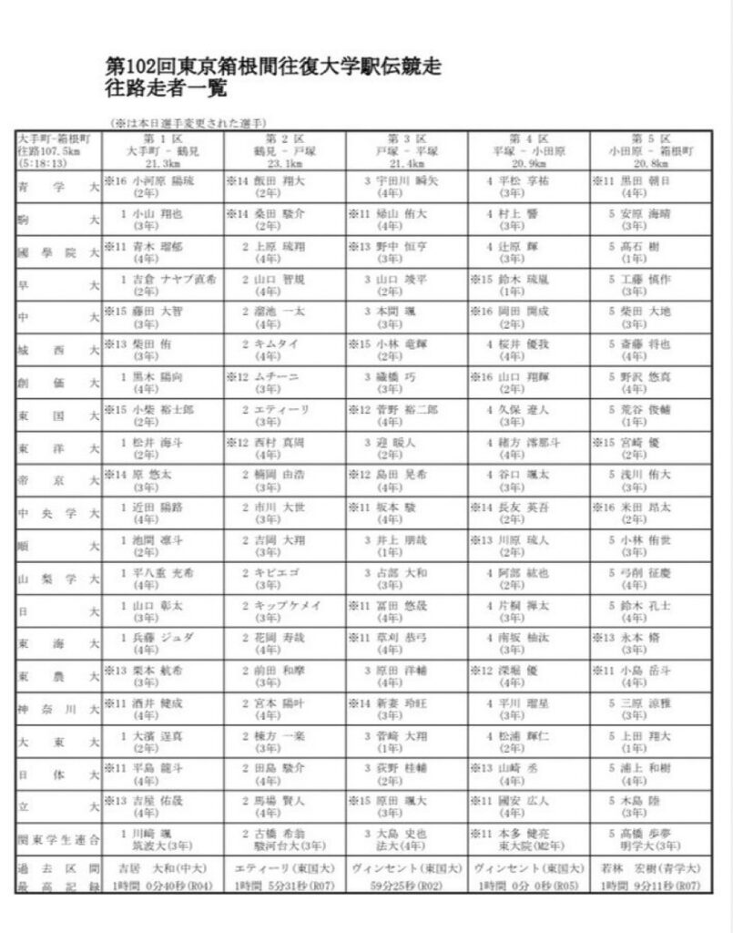 区間エントリー:1区 熊井 志岳/2区 KIMUTAI Victor/3区 坂本 賢志郎/4区 中村 柊/5区 〇山本 朔人/6区 奥村 友希/7区 桜井 奏/8区 鈴木 琉胤/9区 佐藤 優大/10区 木村 瑛太