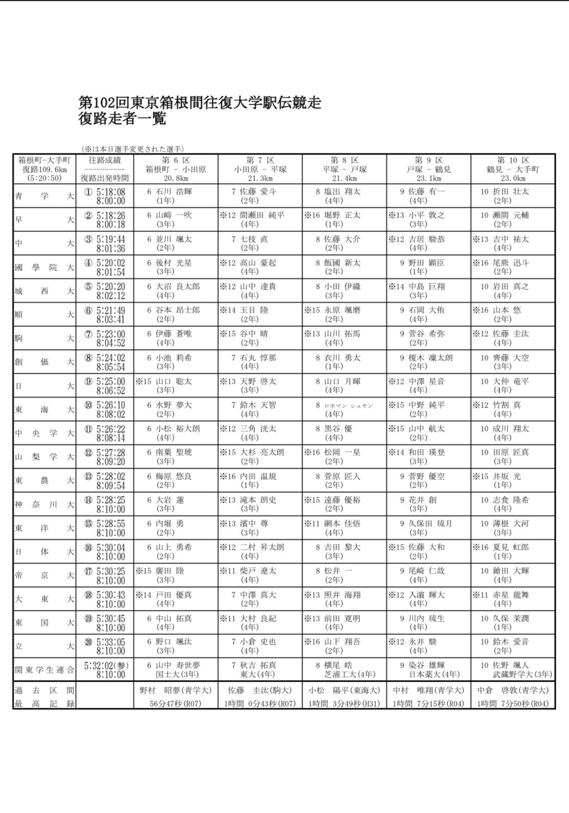 区間エントリー:1区 熊井 志岳/2区 KIMUTAI Victor/3区 坂本 賢志郎/4区 中村 柊/5区 〇山本 朔人/6区 奥村 友希/7区 桜井 奏/8区 鈴木 琉胤/9区 佐藤 優大/10区 木村 瑛太