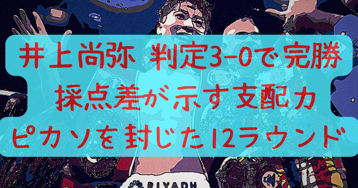 2025年12月27日、サウジアラビアのリヤドで行われた世界スーパーバンタム級4団体統一タイトルマッチで、王者の井上尚弥がアラン・ピカソに判定3-0で勝利しました。試合は12回まで行われ、井上がベルトを守りました。