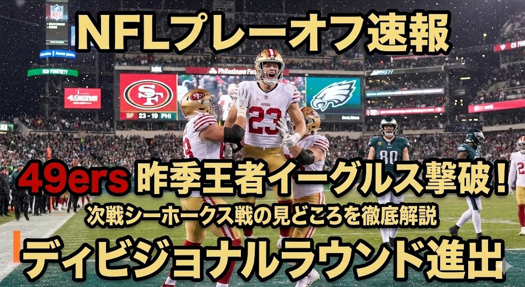 昨季スーパーボウル王者のイーグルスを敵地で倒し、49ersがディビジョナルラウンドへ進出です。プレーオフらしい緊張感のある接戦を、最後に取り切った形になりました。
