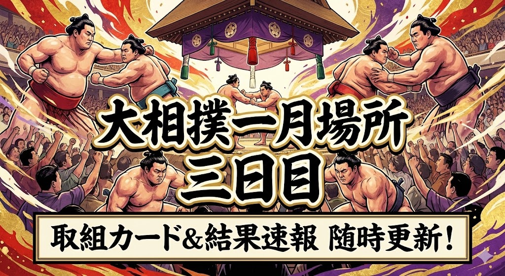 この記事では、3日目の取組カードを中入り後中心に一覧でまとめています。取組が終わり次第、同じページに勝敗と決まり手を追記して結果速報として更新していきます。