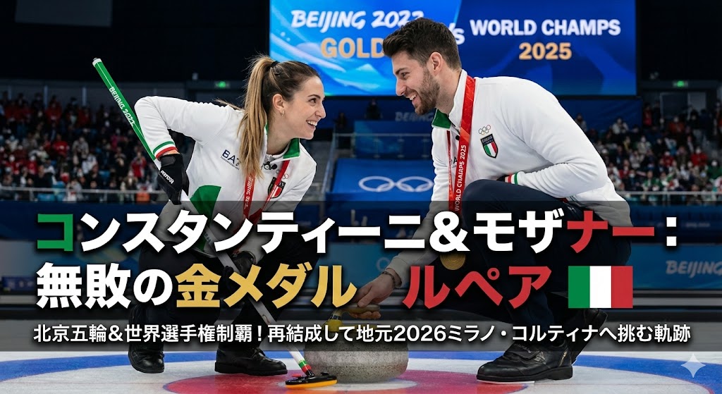ステファニア・コンスタンティーニとアモス・モザナーは、北京五輪の混合ダブルスを無敗で制してイタリアに歴史的な金メダルをもたらしたペアです。女子と男子それぞれの経験を持ち寄り、判断の速さと安定感で勝ち切るのが強みです。再結成後も世界選手権で優勝し、2026地元開催では再び金メダル候補の中心にいます。