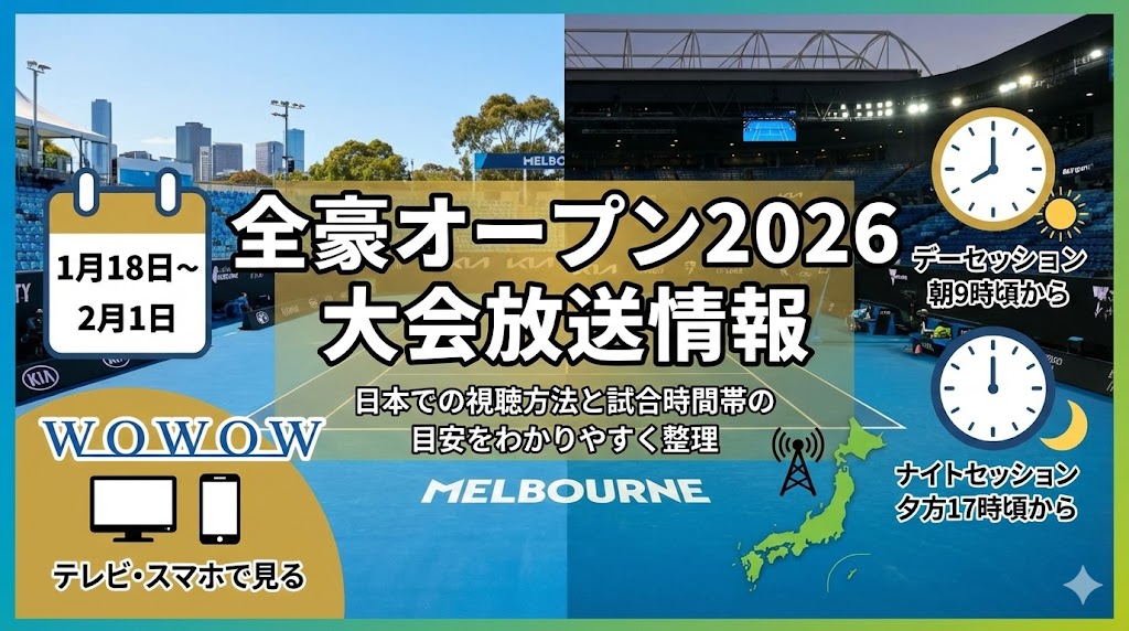 全豪オープン2026を日本で安定して観るなら、WOWOWとWOWOWオンデマンドを軸に考えるのが近道です。日本時間はデーが朝9時前後、ナイトが夕方17時前後がひとつの目安になります。まずは本戦開幕の1月18日から決勝の2月1日に向けて、観戦しやすい時間帯の日を先に押さえておくと、追いかけやすくなります。