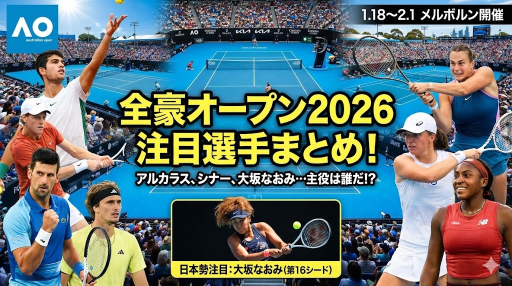 全豪オープン2026は、男子はアルカラスとシナーの頂点争いに、ズベレフとジョコビッチがどう絡むかが大きな軸になります。女子はサバレンカ、シフィオンテク、ガウフを中心に、上位8人がそのまま主役級です。