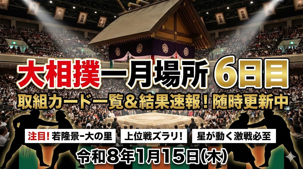 6日目は、若隆景-大の里、豊昇龍-隆の勝、高安-安青錦など、星が動くカードが揃いました。まずは中入り後の取組カードをチェックして、取組後は結果速報で一気に振り返りましょう。