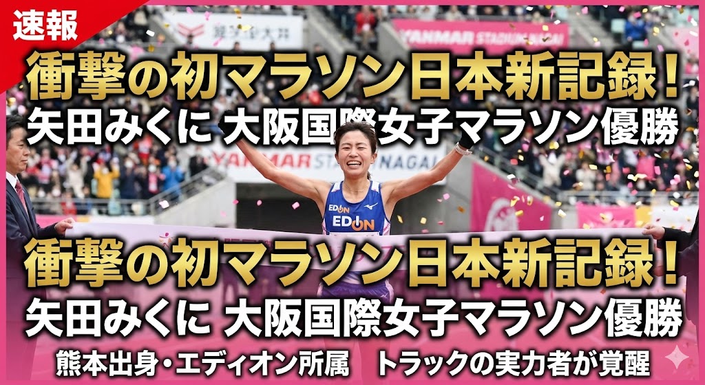 矢田みくに選手は、熊本出身の女子長距離ランナーです。学生時代から国際大会で実績を積み、東京世界陸上などを経て、2026年の大阪国際女子マラソンで初マラソン日本新記録を樹立しました。