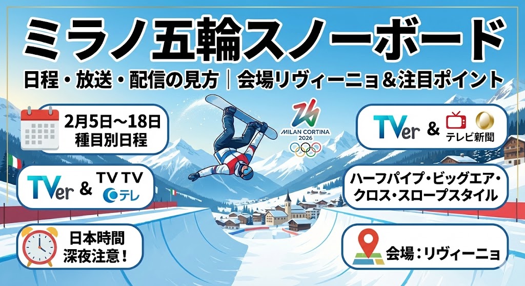 この記事では、ミラノ・コルティナ五輪のスノーボードについて、会場、種目、日程の全体像、日本時間の考え方、放送配信の探し方をまとめます。