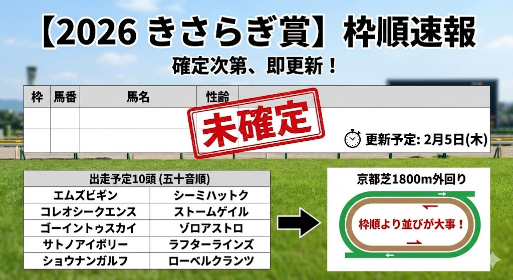 この記事では、2026年きさらぎ賞の「枠順速報(確定次第追記)」と、事前に役立つ出走予定10頭の一覧、京都芝1800外回りのポイントをまとめます。ブックマーク推奨です。