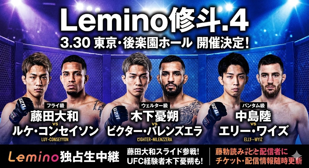 この記事では、3月30日に開催される「Lemino修斗.4」の対戦カードと、視聴方法の最新情報を随時更新でお届けします。