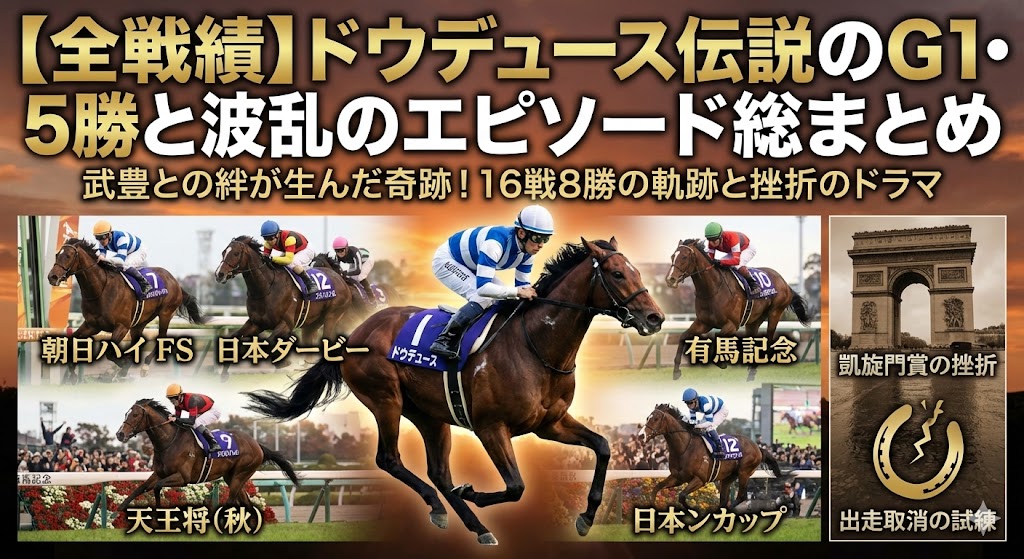 ただ強いだけの馬じゃない。負けて、どん底まで落ちて、それでも最後の大舞台で絶望的な位置から全部ひっくり返して勝つ!だからドウデュースと武豊のコンビはたまらんのよ。この記事では、そんなアイツの激動のドラマを全戦績と一緒に振り返るで!