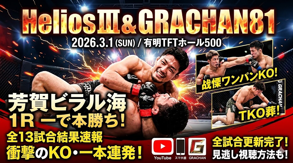 芳賀ビラル海選手の鮮烈な一本勝ちや、梅本弘祐選手の戦慄ワンパンKOなど、完全決着が続出した今大会の「全試合結果」と、衝撃のフィニッシュシーンを映像で振り返る「見逃し視聴方法」をまとめました。