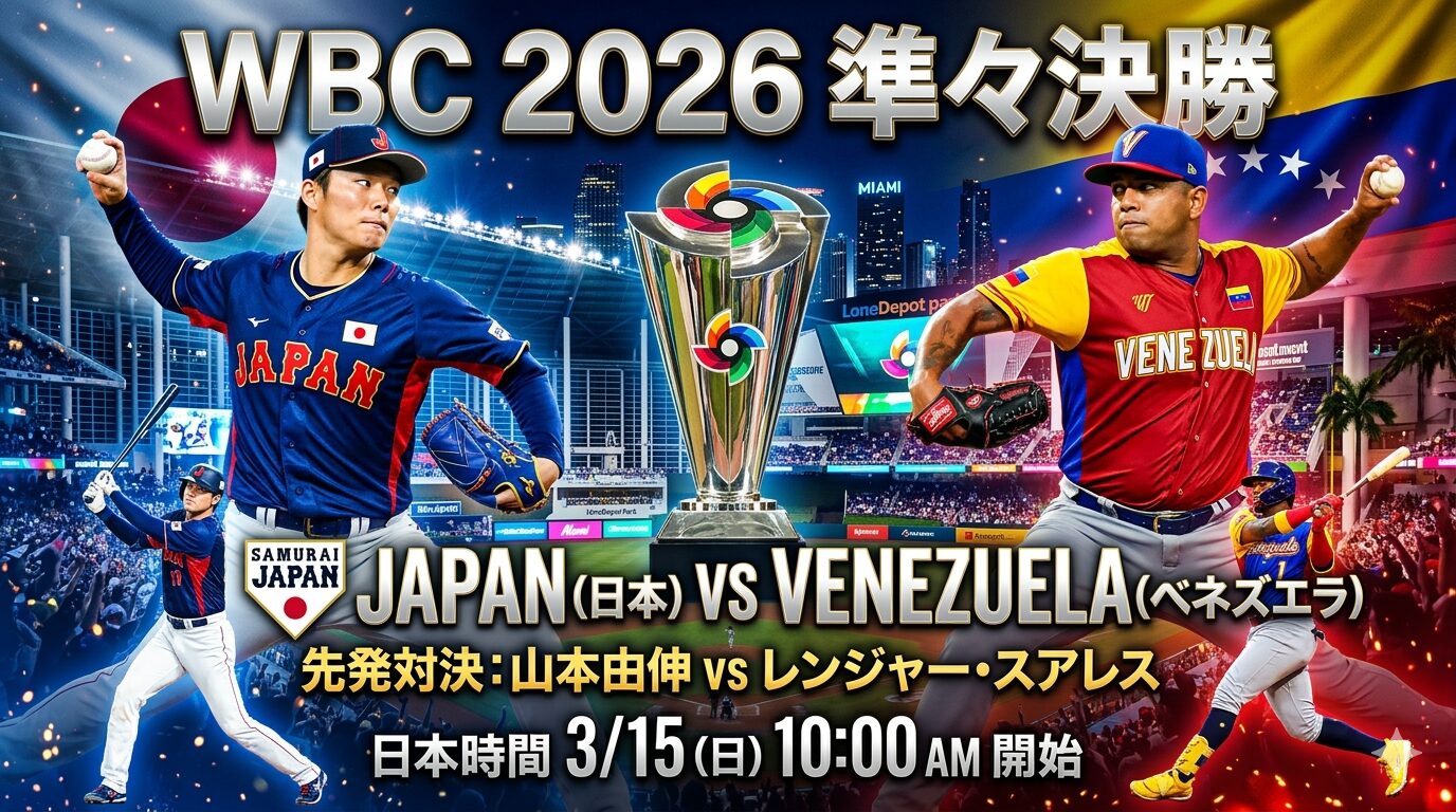 侍ジャパンはWBC2026準々決勝でベネズエラと対戦します。試合は日本時間3月15日10時開始予定で、予告先発は山本由伸とレンジャー・スアレス。無敗同士がぶつかる、今大会屈指の注目カードです。