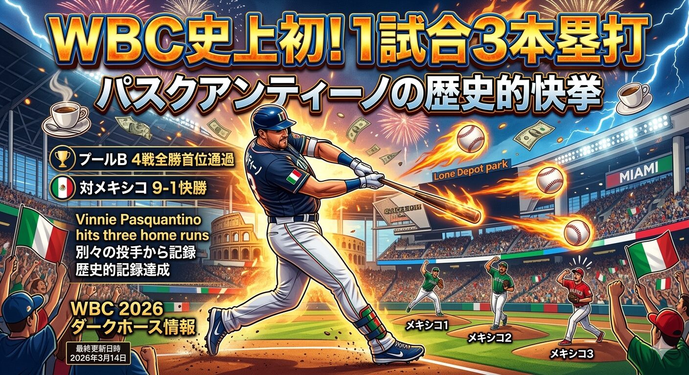 この記事では、パスクアンティーノのWBC史上初の3本塁打の価値、イタリア代表が強い理由、そして今大会でどこまで勝ち進めるのかを分かりやすく整理します。