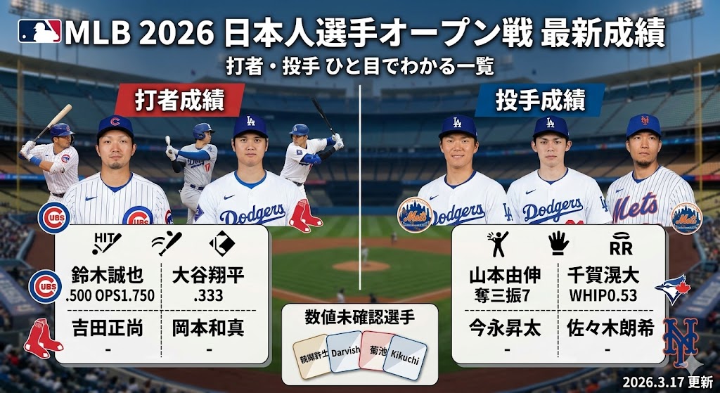 最終更新日:2026年3月17日(※大谷翔平、佐々木朗希、村上宗隆、岡本和真ら日本人メジャーリーガー全15名の最新オープン戦成績を更新しました!)