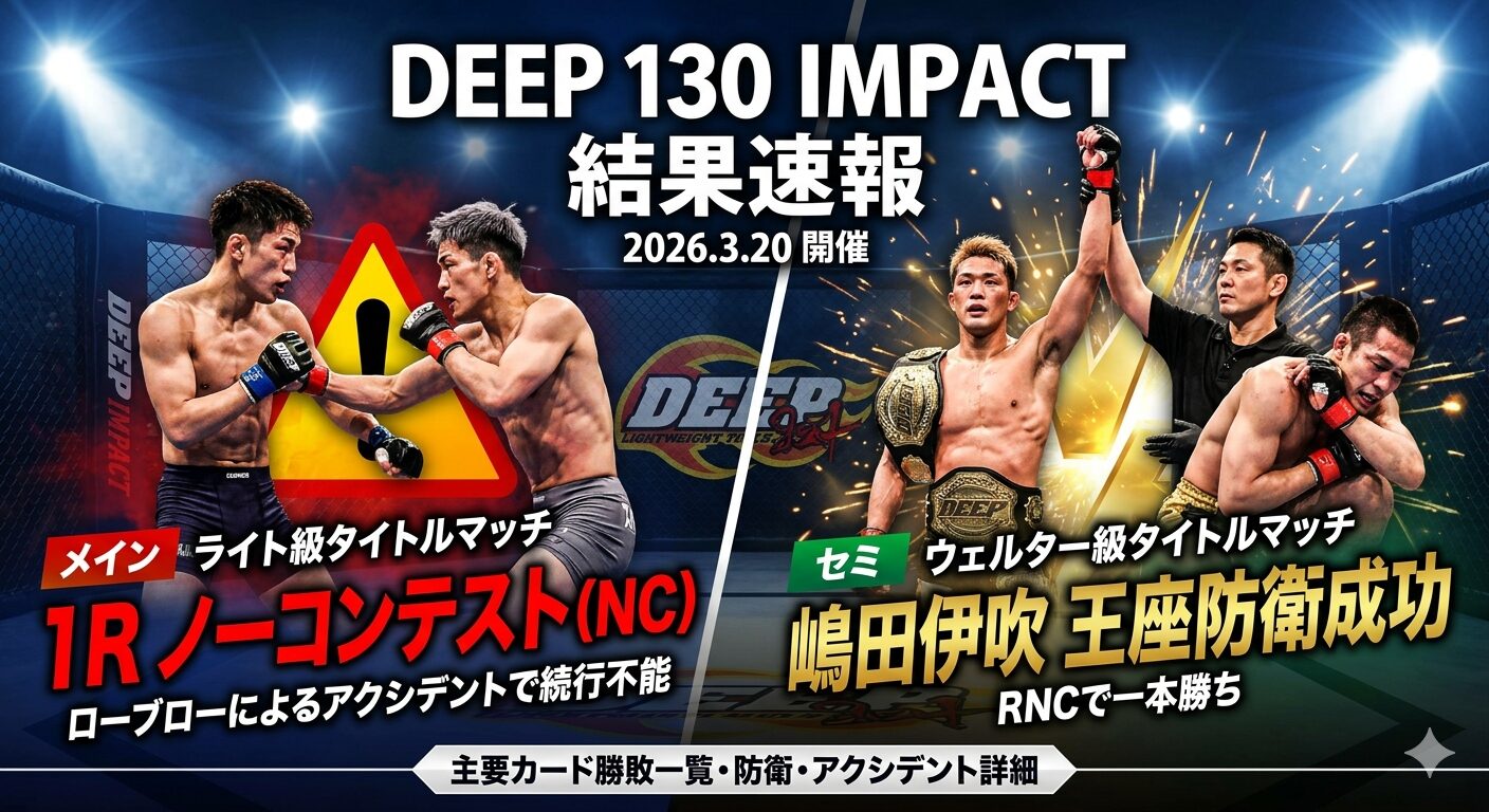 2026年3月20日に開催されたDEEP 130 IMPACTは、メインとセミで王座戦が組まれた注目大会となりました。メインのDEEPライト級タイトルマッチは、ローブローによるアクシデントで1Rノーコンテスト。一方、セミのDEEPウェルター級タイトルマッチでは、嶋田伊吹がストラッサー起一をリアネイキッドチョークで下し、王座防衛に成功しています。