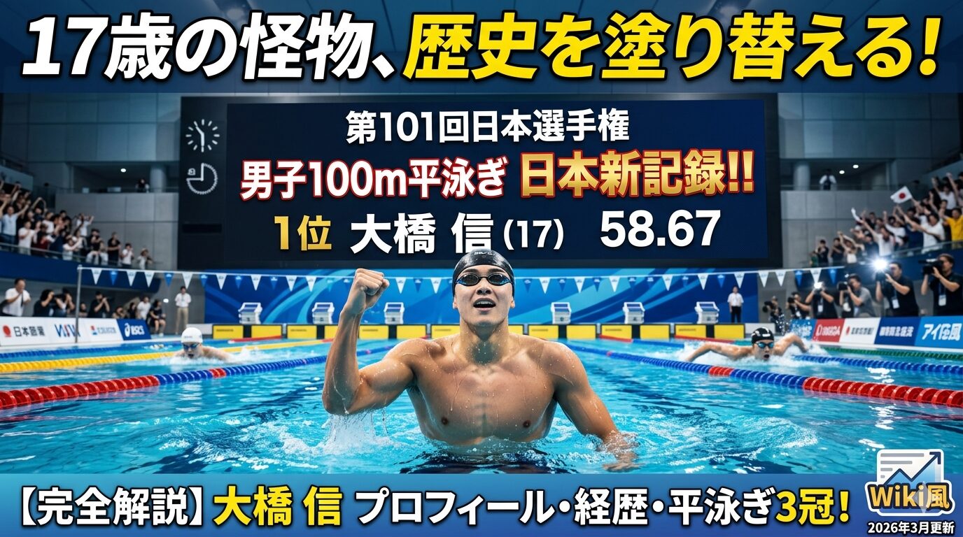 この記事では、日本競泳界に突如現れた17歳の怪物・大橋信選手のプロフィールから「どこがすごいのか」までをWiki風にわかりやすくまとめます。ニュースで初めて名前を知った方でも、読み終わるころには彼がいかに「歴史的な天才」であるかがしっかり整理できます。