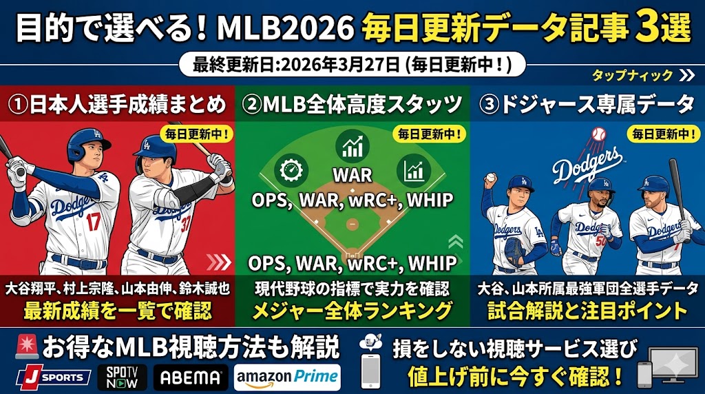 MLB2026最新成績まとめ 日本人選手 MLB全体スタッツ ドジャース個人成績 視聴方法まで一気にわかる