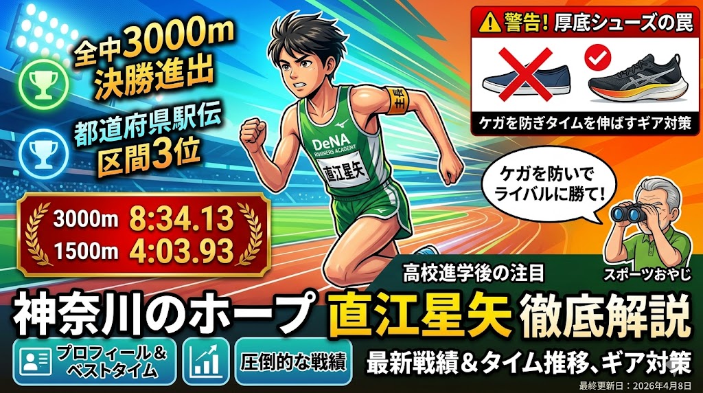 最終更新日:2026年4月8日(※直江星矢選手の驚異的なタイム推移と、超・高速化時代でケガを防ぎタイムを伸ばすための「必須ギア対策(厚底シューズの罠)」を追記しました)