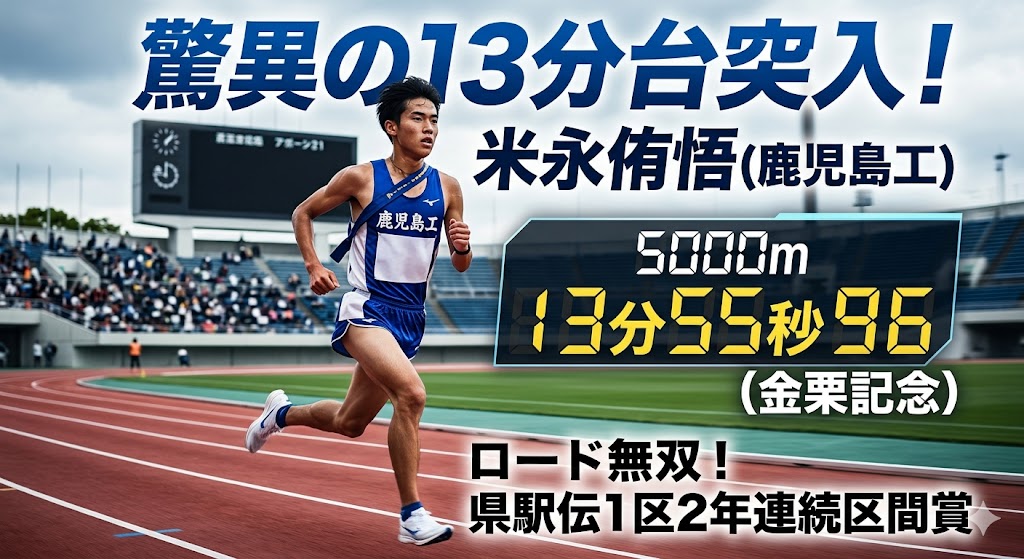 米永侑悟選手は、中学時代の9分14秒から劇的な成長を遂げ、高校で九州新人優勝、県駅伝1区2年連続区間賞、そして5000mで「13分55秒96」を叩き出した、世代最強クラスのオールラウンダーです。