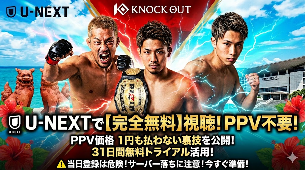 最終更新日:2026年4月13日(※【超速報】木村ミノル参戦!鈴木千裕エキシビション!KNOCK OUT.63 沖縄大会の全カードと、U-NEXTで「完全無料視聴」するための裏技を追記しました)