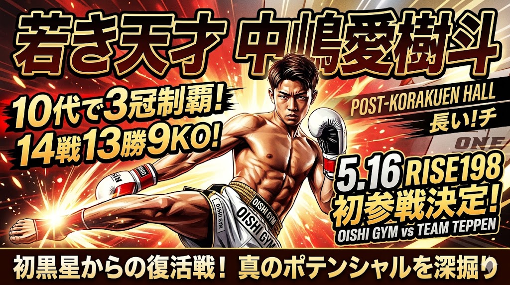 最終更新日:2026年4月14日(※10代で3冠を制覇した若き天才・中嶋愛樹斗選手の最新戦績と、5月16日開催「RISE198」への初参戦情報を深く掘り下げて追記しました)