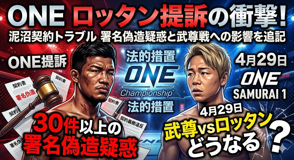 最終更新日:2026年4月15日(※ONE Championshipがロッタンへの法的措置を公表。「30件以上の署名偽造疑惑」など泥沼化する契約トラブルの経緯と、4月29日の武尊戦への影響を最新情報ベースで整理しました)
