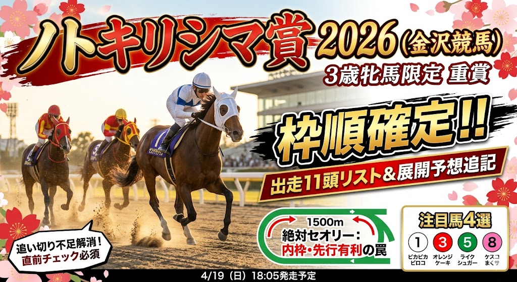最終更新日:2026年4月16日(※4月19日開催「ノトキリシマ賞2026」の確定した枠順・出走馬11頭のリストと、金沢ダート1500mの「絶対的セオリー」を深く掘り下げて追記しました)