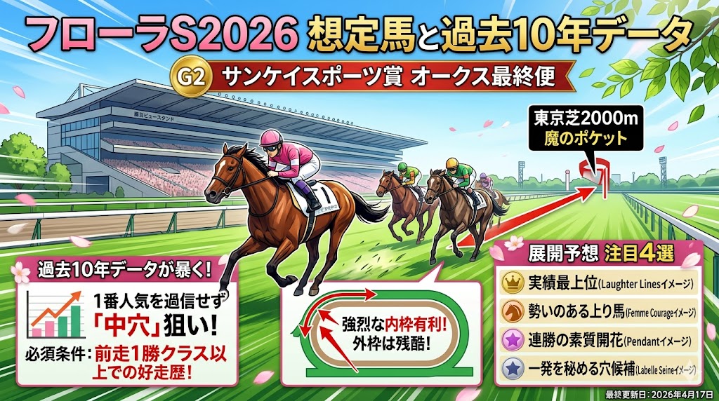最終更新日:2026年4月17日(※4月26日開催「フローラステークス2026」の出走予定馬リストと、過去10年データが暴く「東京芝2000m・魔のポケット」の攻略法を深く掘り下げて追記しました)