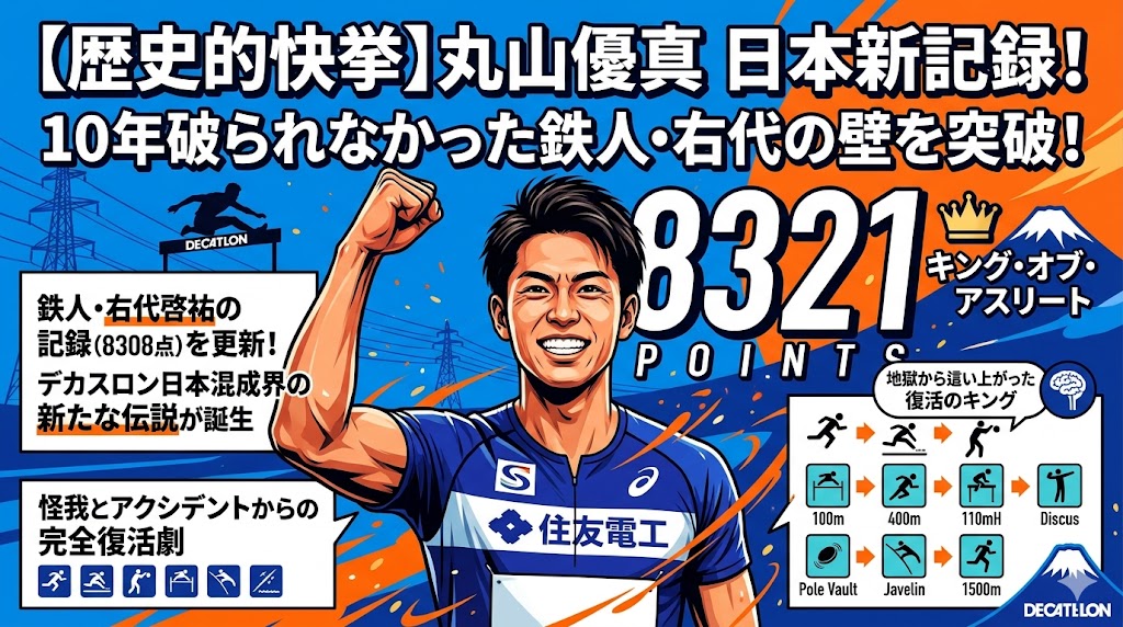 オヤジたち、十種競技(デカスロン)の日本記録って、あの鉄人・右代啓祐選手が作った「8308点」から10年以上も破られてなかったんや。それをこの春(2026年4月)、アメリカの大会で丸山選手が「8321点」を叩き出して塗り替えてしまったんやから、これはもう大事件やで!