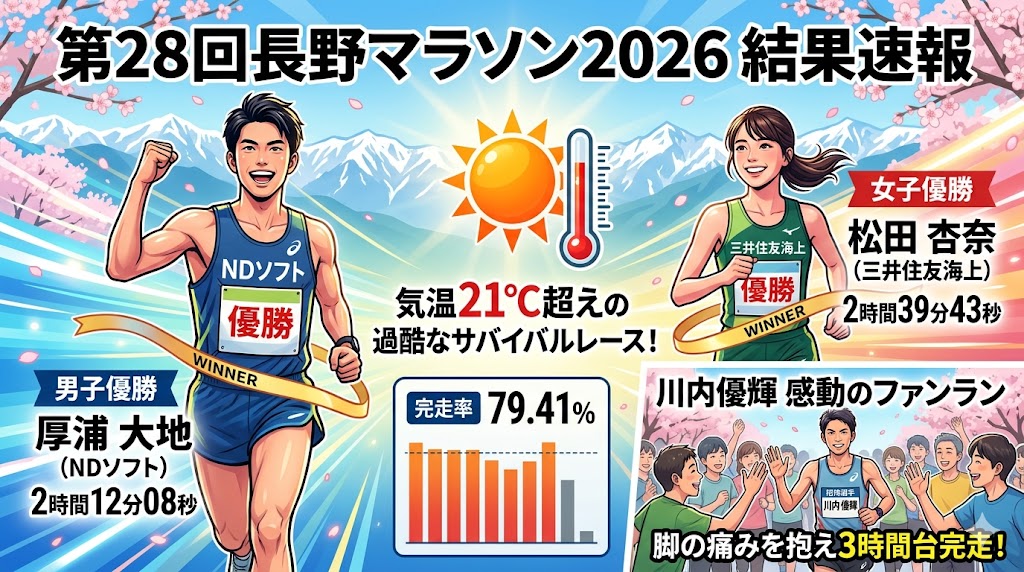 最終更新日:2026年4月19日(※本日開催された「第28回長野マラソン2026」の男女上位結果、完走率79%の過酷な気象データ、そして川内優輝選手の感動のファンランを深く掘り下げて追記しました)
