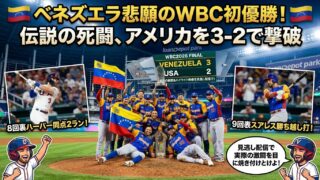 WBC2026決勝戦「アメリカ vs ベネズエラ」の試合結果と詳細ハイライト!ベネズエラが9回にスアレスの劇的タイムリーで勝ち越し、3-2で悲願のWBC初優勝を飾りました。歴史的死闘のハイライト映像・見逃し配信をスマホで無料視聴する方法も解説します。